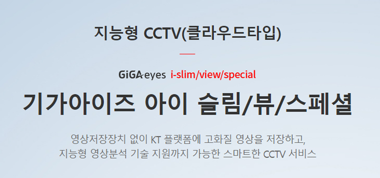 CCTV는 클라우드 방식이 출시되면서 큰 규모의 회사가 아니면 클라우드를 건설 운영하기가 어렵기 때문에 여건이 대는 대기업에서 출시를 하는 상황이 되었습니다. 국내 1등 인터넷 회사인 KT에서도 클라우드 방식의 CCTV를 기가아이즈(GiGAeyes)라는 브랜드 명을 가지고 출시하게 되었습니다. GiGA란 1000M 속도를 표현한는 용어인데 그 많큼 바르게 영상을 저장하고 고화질로 클라우드에 저장 보관 할 수 있는 장점과 eyes는 눈이란 의미로 고화질의 영상을 클라우드에 보관 저장하여 언제든지 고객님께서 확인하실 수 있다는 브랜드 명입니다. KT GiGAeyes는 믿고 사용할 수 있는 클라우드 방식의 영상 CCTV 서비스 입니다.