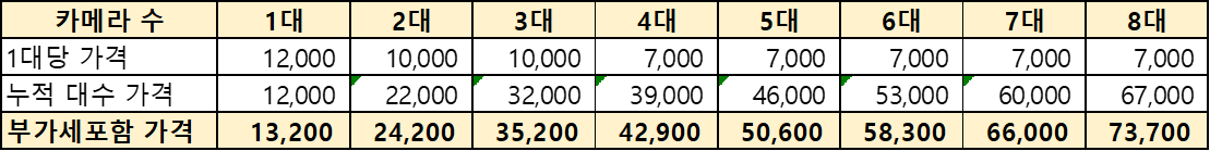 가격은 1대 17,000원(vat별도)입니다. 추가 1대를 신청해야 2대가 될 경우 추가분은 10,000원(vat별도)입니다. 최대 8대까지 가능합니다. 인터넷을 필수로 하기 때문에 인터넷 사용에 따른 결합할인이 첫번째 카메라에 적용이 됩니다. 결합할인은 5,000원으로 결합할인을 적용하고 나면, 첫번째 카메라가 12,000원(vat별도)입니다.