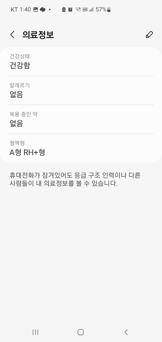 휴대폰 비밀번호 창에 아래에 긴급연락 버튼을 누르면 아래 의료정보와 긴급전화 대상이 설정되어 있음을 확인할 수 있습니다. 간단한 설정이지만 긴급할때 나를 살리는 SOS 설정이니 꼭 하시기 바랍니다,
