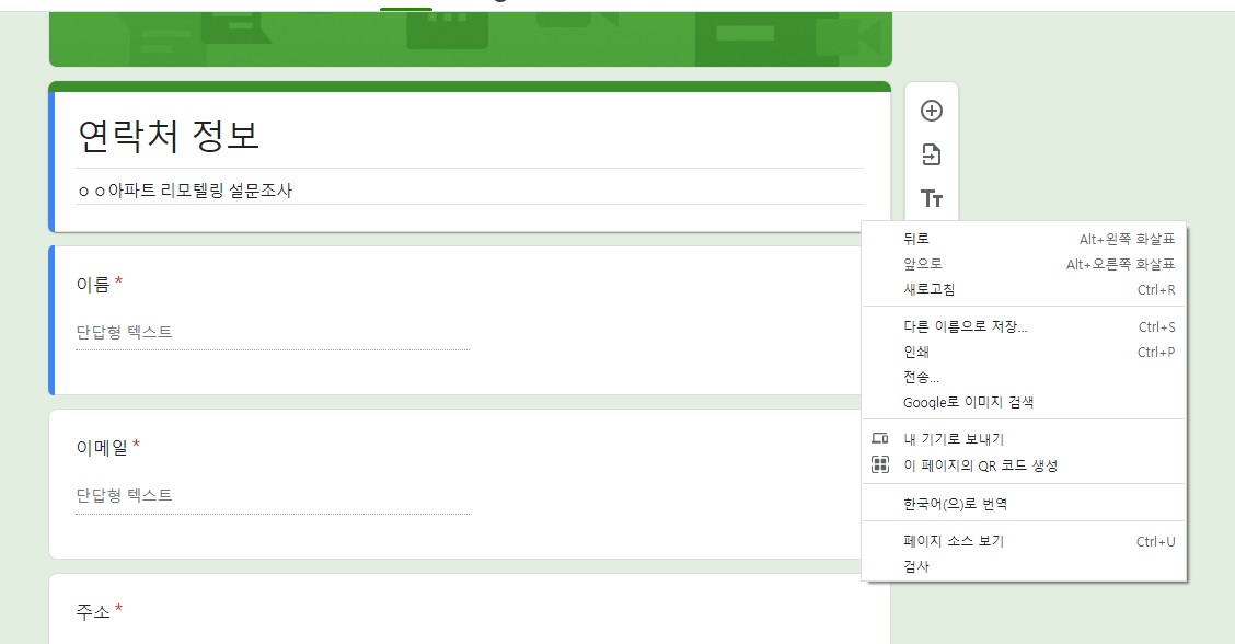 그럼 설문지가 나타납니다. 그 바탕화면에 오른쪽 마우스를 클릭하면