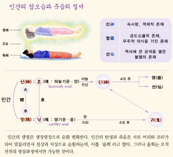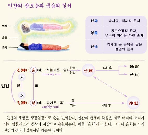 - 죽음은 겉사람(육체)과 속사람(영체)이 분리되는 현상이며, 이를 1차적 죽음이라 합니다. 분리된 겉사람은 수명을 다해 없어지지만, 속사람은 다시 혼(魂)과 넋(魄)이라는 음양으로 나뉘어 본래 생겨난 자리인 하늘과 땅으로 환원되어 신神과 귀鬼가 됩니다. 즉 몸이 늙어 죽으면 몸속에서 생명의 총수역할을 하던 영신은 몸에서 이탈하여 신명神明(신神)으로 다시 태어나게 됩니다.