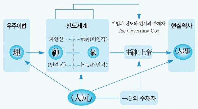- 또한 인간의 현실역사(事)는 하늘의 명(理)을 받아 신도(神)에서 주재하여 먼저지은 후에 사람이 비로소 행行함으로써 현실로 이뤄지게 됩니다. 즉 인사는 인간과 신명의 공동합작품인 것입니다.