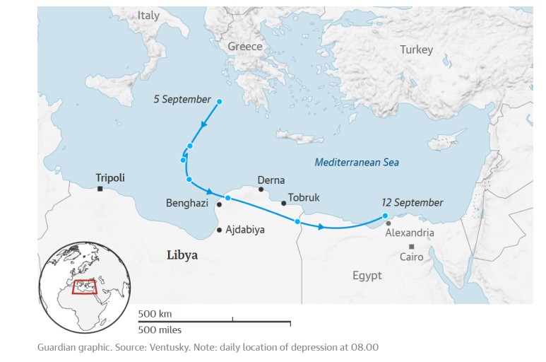 지중해에서 발원한 태풍 '다니엘'은 전날 리비아 동부 해안가에 상륙해 데르나(Derna) 인근 댐 두 곳을 파괴했다. 2023.09.10일 데르나 수위는 순식간에 3m로 올라갔고 인근 주민 약 10만명이 위험에 처했다. 잇삼 아부 제리바 동부 리비아 내무장관은 수천명 이상이 데르나에서 실종되고 이들 중 상당수가 지중해로 떠내려갔을 것이라고 추측했다.
