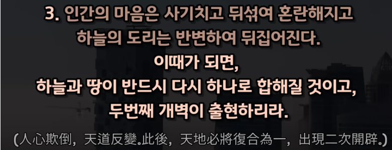 이 때가 되면, 하늘과 땅이 반드시 다시 하나로 합해질 것이고, 두번째 개벽이 출현하리라.