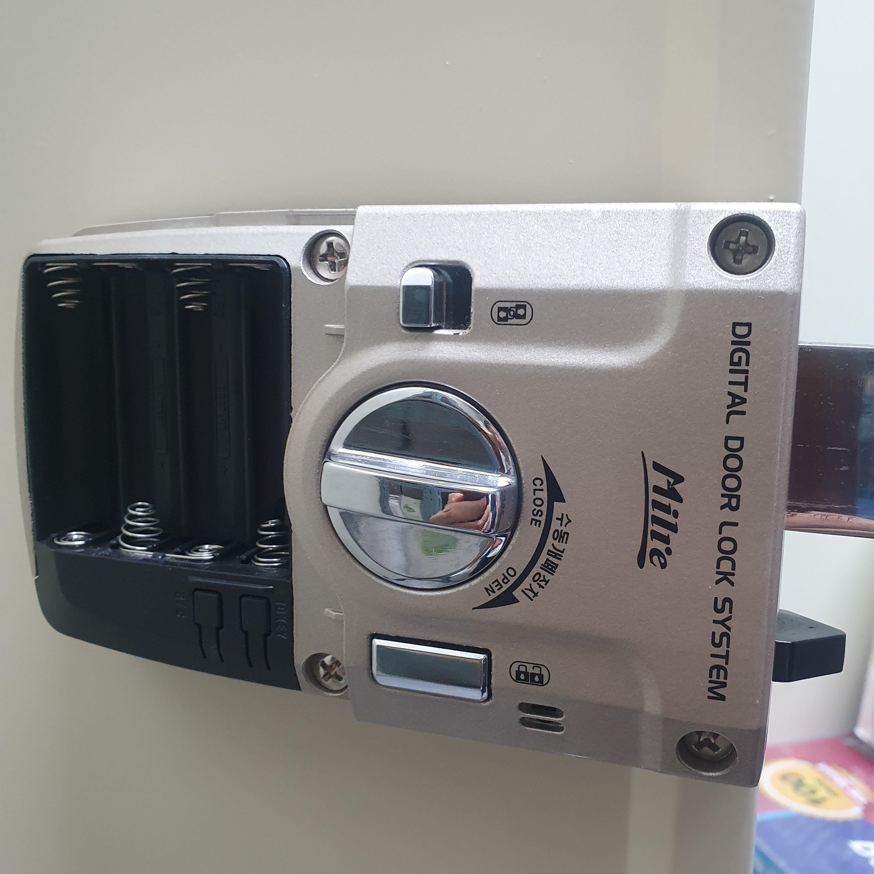 사무실에 작은 창고 잠금장치 도어락이 있다.