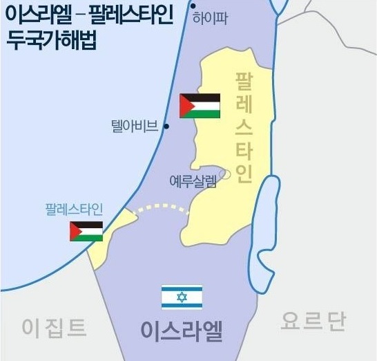 이스라엘과 펠레스타인의 두국가 해법이다. 가자지구와 팔레스타인 간의 도로로 연결하여 그들끼리 살수 있도록 할 필요가 있다. 유엔에서 나서서 위 해법을 제시하고 협상하여 국경을 분명하게 정해 줄 필요가 있다. 그래야 이스라엘이 가자지구 점령하려는 야욕을 못하게 하고 대신 평화를 줄 필요가 있다.