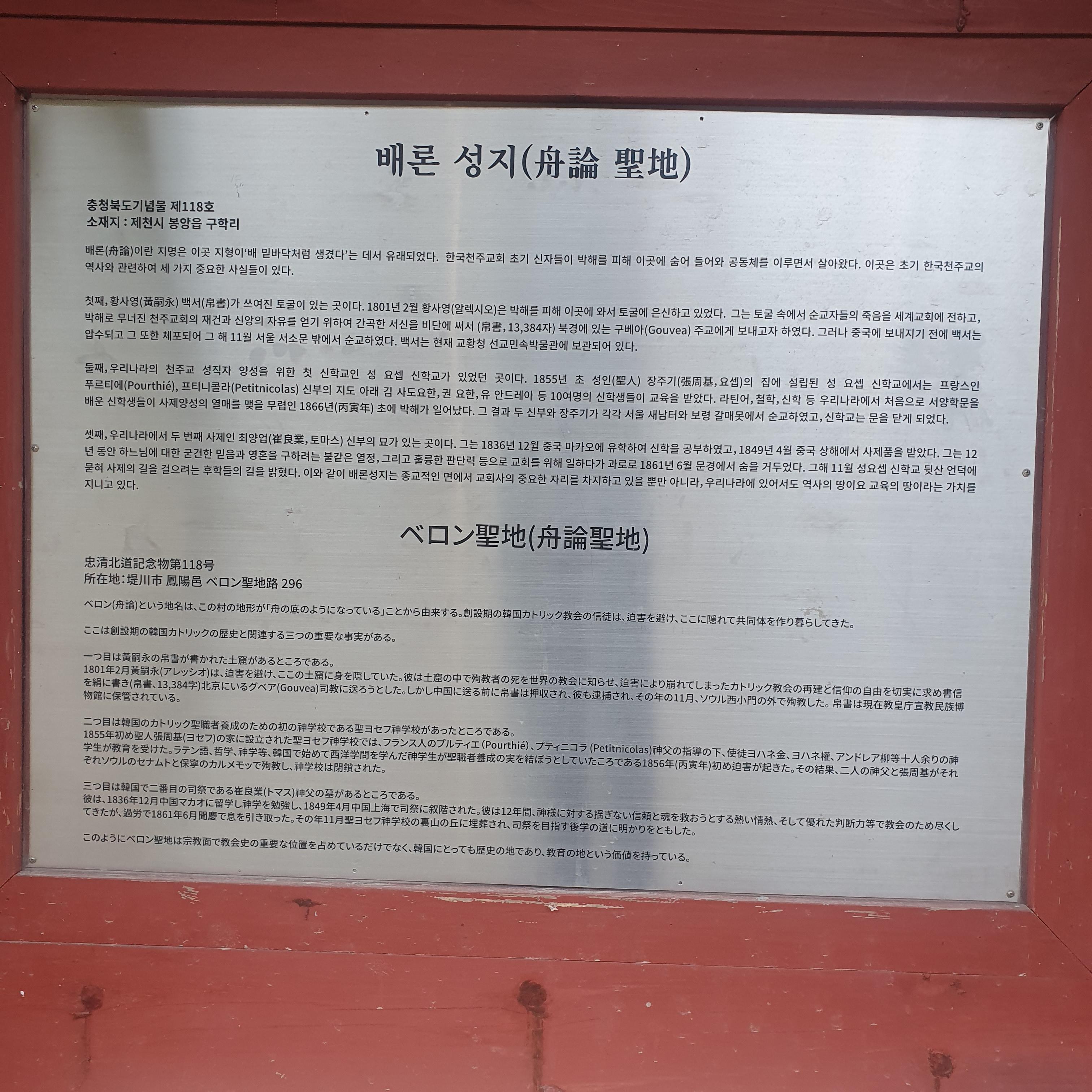 배론(舟論)이란 지명은 이곳 지형이 '배 밑바닥처럼 생겼다.'는 데서 유래되었다.