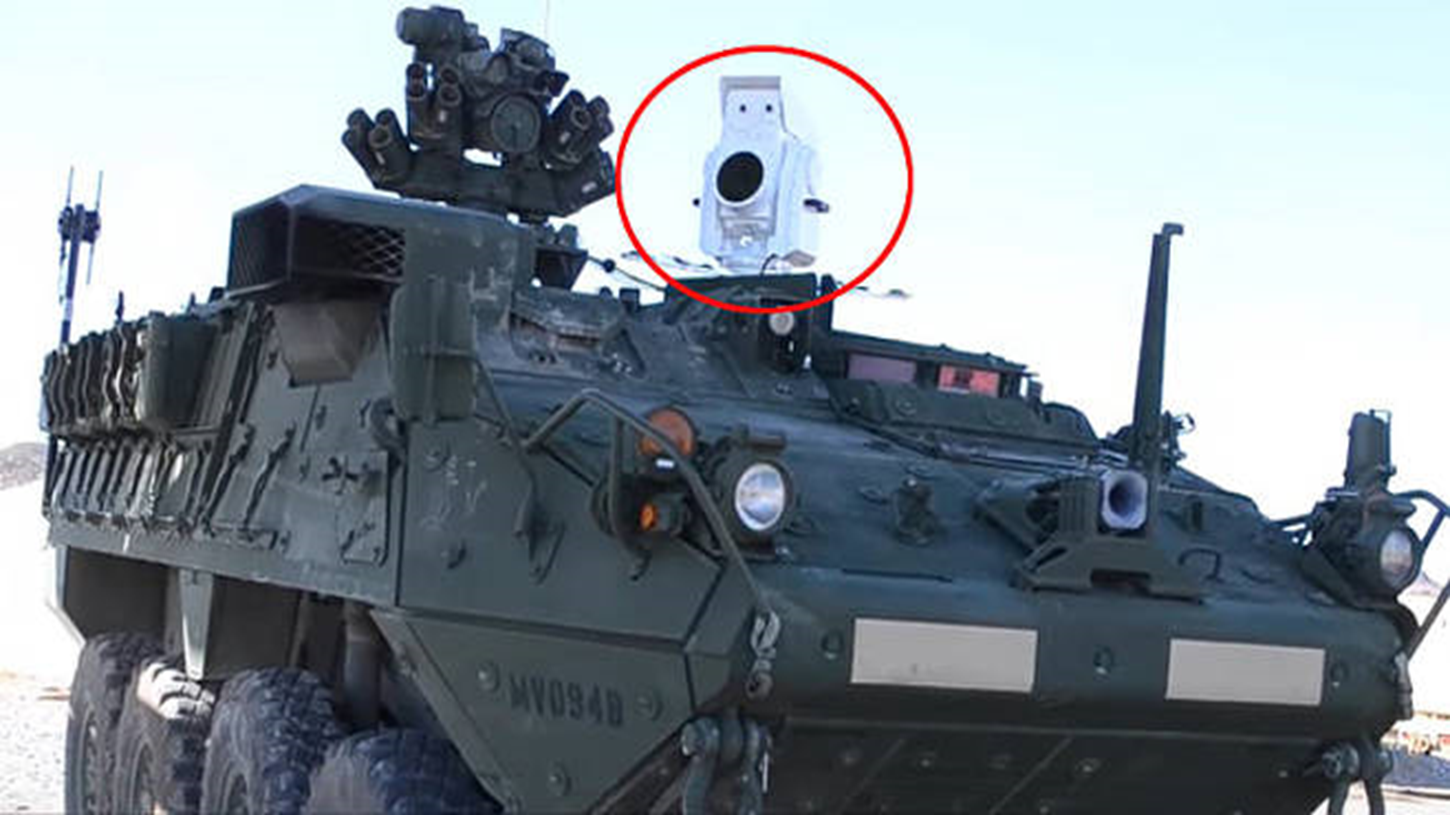 미 육군 우주미사일방어사령부(SMDC)가 개발 중인 ‘이동식 고에너지 전술레이저’(MTHEL). 기동성이 뛰어난 18t 무게의 ‘스트라이커 장갑차’에 보잉사가 무인기 요격용으로 개발한 5㎾ 레이저포(원안)를 장착한 모습이다. (2017년 공개)