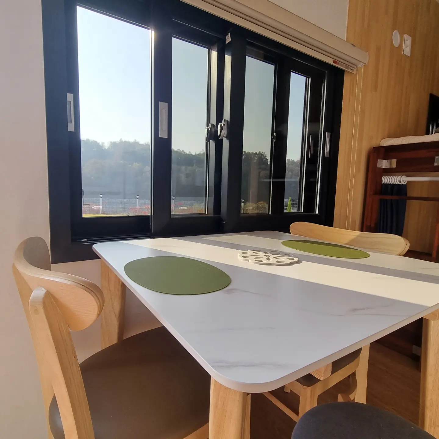 카라반안에서 식사를 할 수 있도록 식탁이 준비되어 있다.