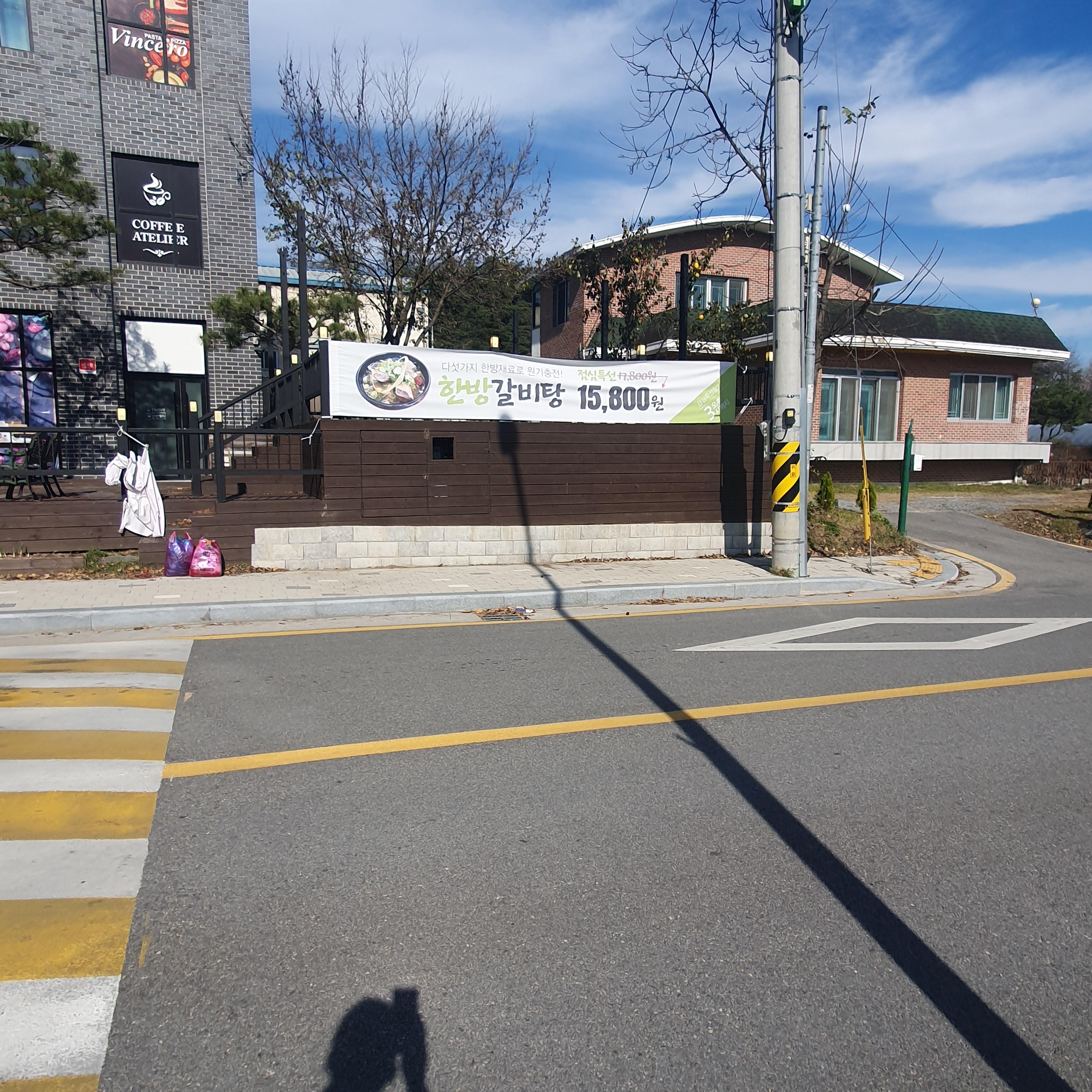 오늘의 점심특선 한방 갈비탕 현수막이 있다.