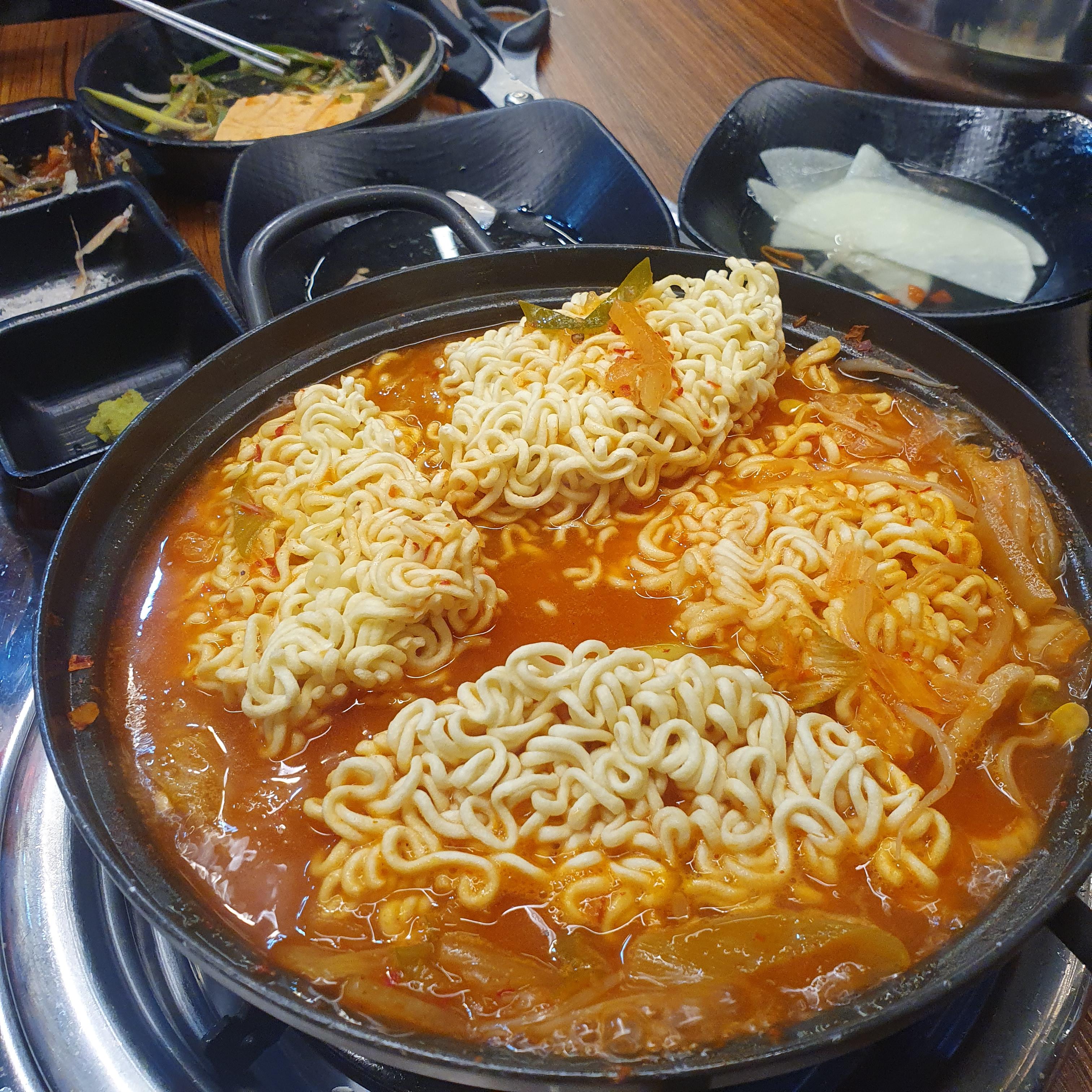 두부김치찌개 남은것에 라면사리 2개를 주문해서 요리했다.