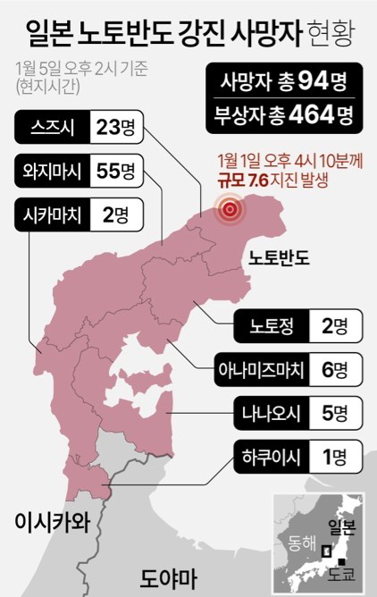 2024.1.5일 오후 2시 기준 사망자는 94명이다.