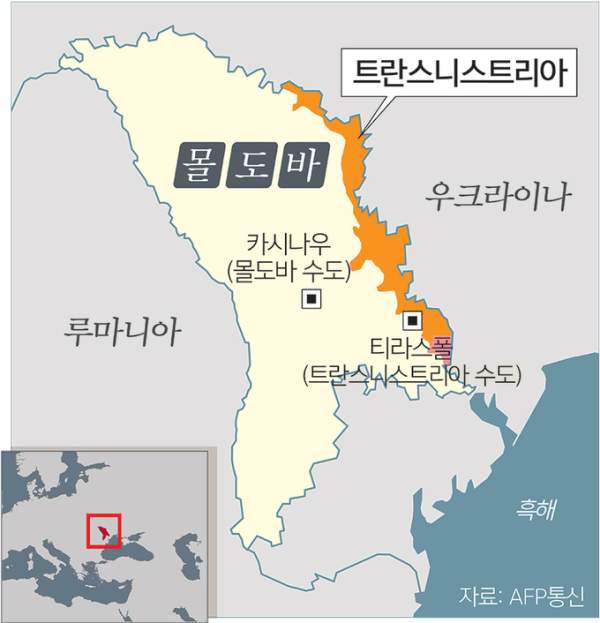 몰도바 동쪽의 띠처럼 생긴 친러시아 지역입니다. 22만명의 러시아시민이 거주하고 있는데 여기에는 구소련시절 배치한 거대한 탄약, 포탄 창고가 있습니다.