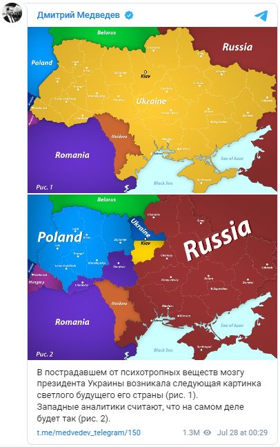 ▶ "메드베데프 지도"에 따른 우크라이나 분할도 가능하지만 장기적으로는 국경이 지도에서 왼쪽으로 크게 이동합니다. 이 경우 키예프가 있는 중앙 부분과 인근 지역 두 곳만 국가에 남을 수 있습니다.