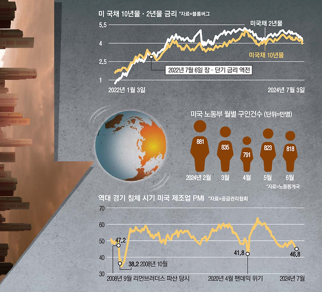 미국 경기침체론은 무엇보다 파월 연준 의장도 우려한 고용시장의 급속한 냉각이 주요 원인으로 꼽힌다. 2024.08.01일(현지시간) 미국 공급관리협회(ISM)에 따르면 올해 2024.07월 고용지수가 43.4를 기록해 팬데믹 직후인 2020년 6월이후 4년 1개월만에 가장 낮았다.