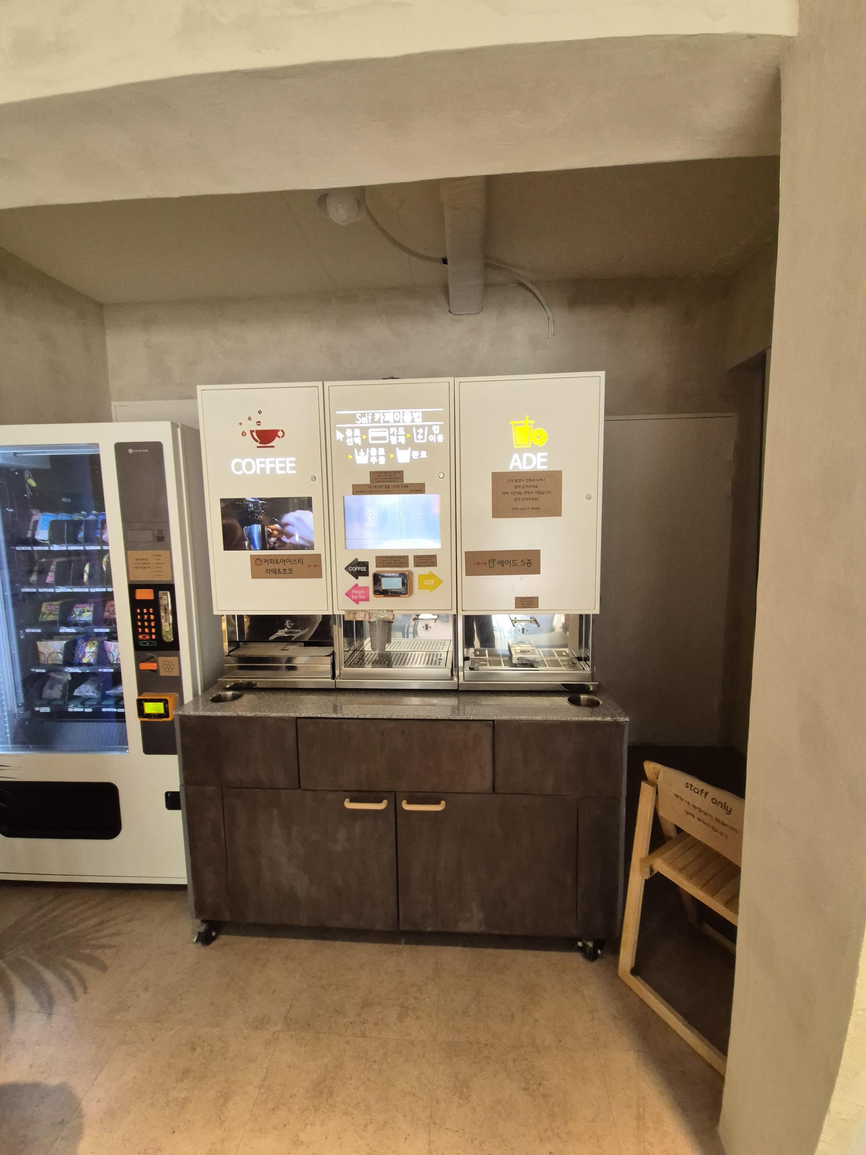 자동판매기가 있다, 왼쪽에는 과자도 있고 오른쪽에서도 음료가 있다.